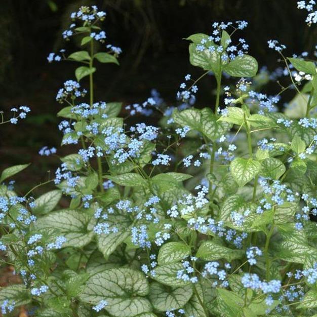 Jack Frost Brunnera (Brunnera macrophylla), commonly called Siberian bugloss or False Forget Me Not, clump-forming perennial that is primarily grown in shady areas for its attractive heart-shaped, dark green, basal foliage. The tall, delicate flowers are reminiscent of Forget Me Nots, blue with white centers. Small and airy, these flowers look great when the Jack Frost Brunnera is planted en masse or as a stand alone piece. Basal leaves form a foliage mound which remains attractive throughout the growing season.